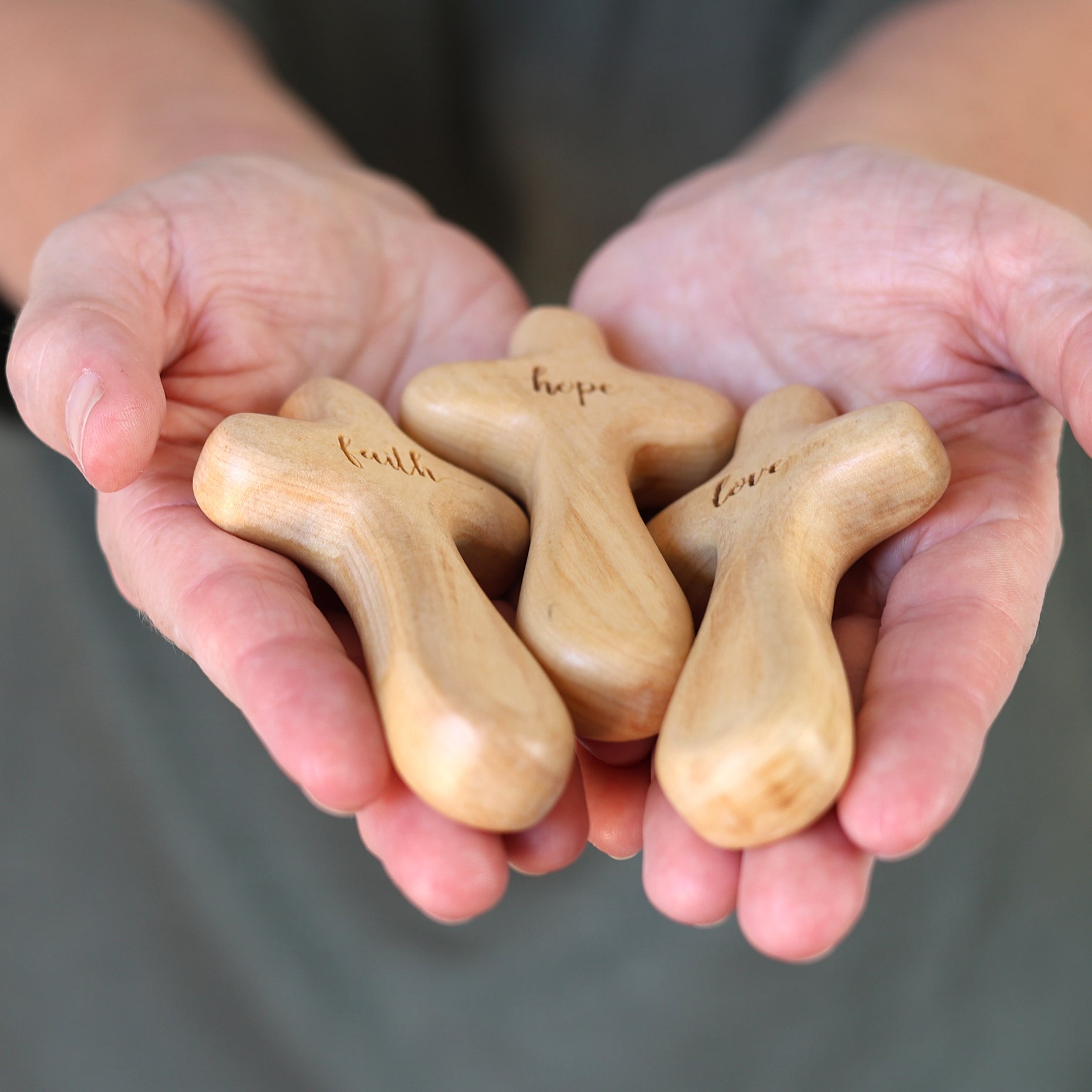 These three little virtuous words are delicately inscribed on pure olive wood prayer crosses, which are made in The Holy Land. We chose crosses with little to no grain pattern to prevent the engraved texts from being interfered with.